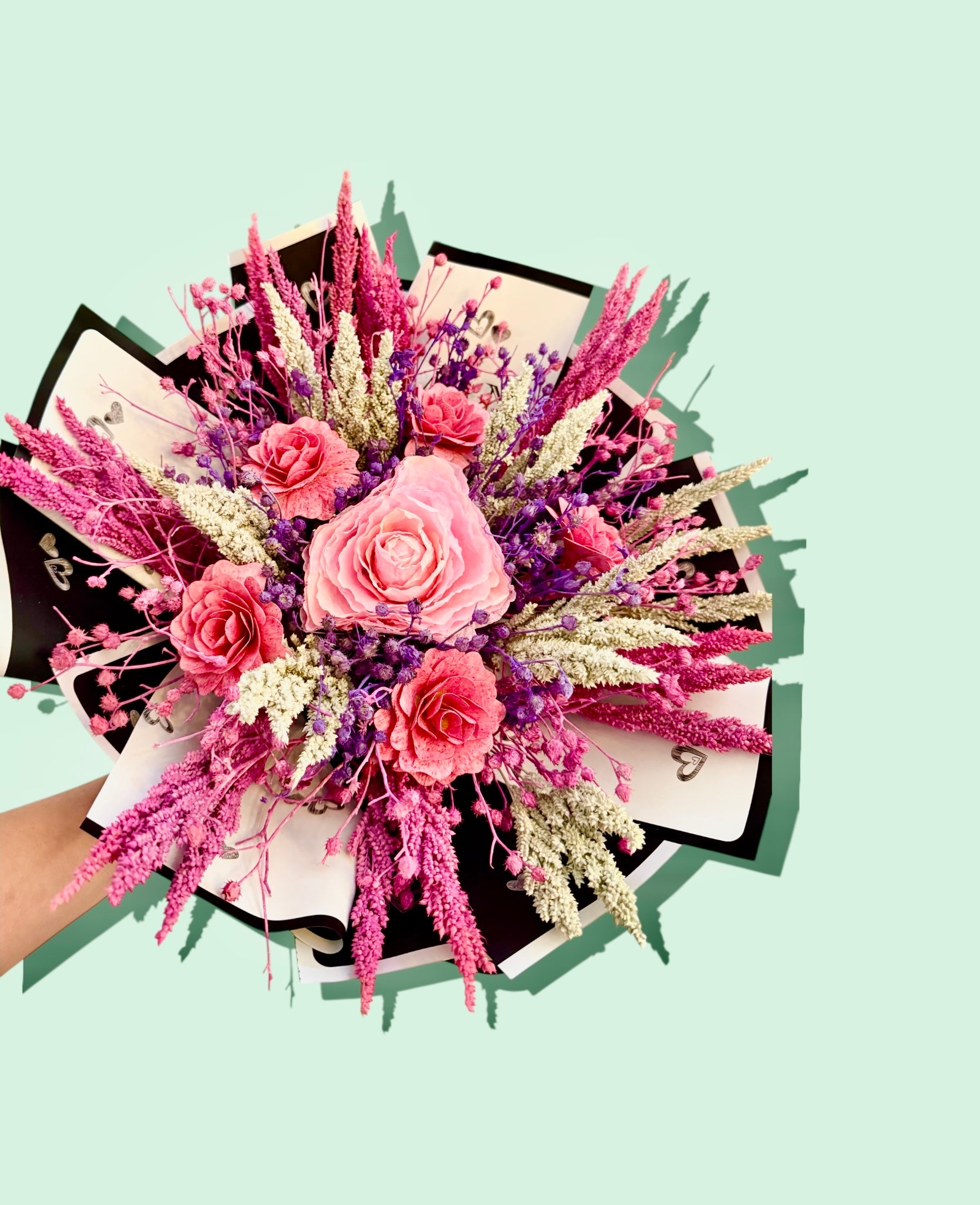 Locally sourced from the flower market. Consists of assorted flowers like roses, alstromerias, malaysian mums, rice flower or statice.